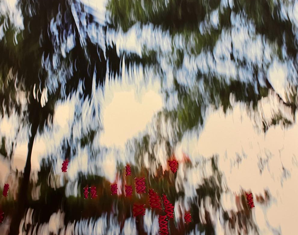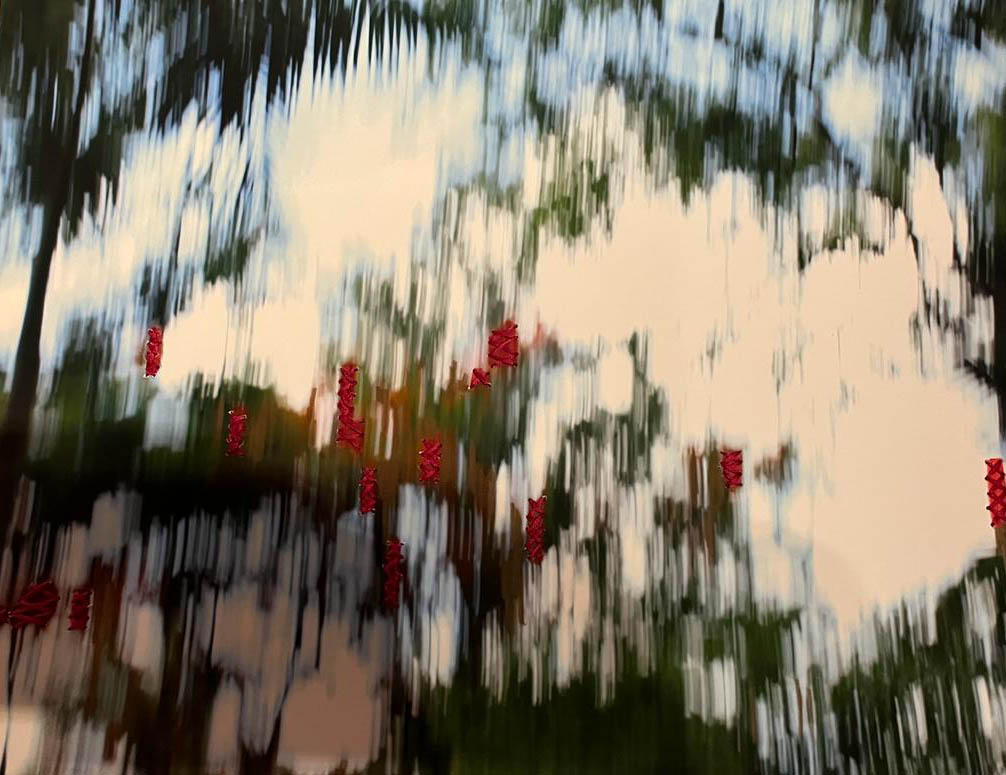 Usando fotografías digitales barridas de framboyanes, he bordado en punto de cruz con hilos de color rojo el lugar donde estarían las flores que embellecen el árbol. He zurcido los árboles para tratar de repararlos, así como en muchas ocasiones las almas necesitan ser reparadas.